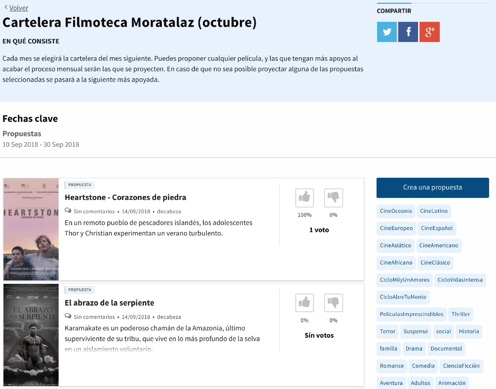 Otro ejemplo de uso son las filmotecas ciudadanas. En este caso la gente envía como propuestas películas que les gustaría ver proyectadas en el centro cultural de su distrito. Las propuestas más apoyadas son las elegidas para la proyección.