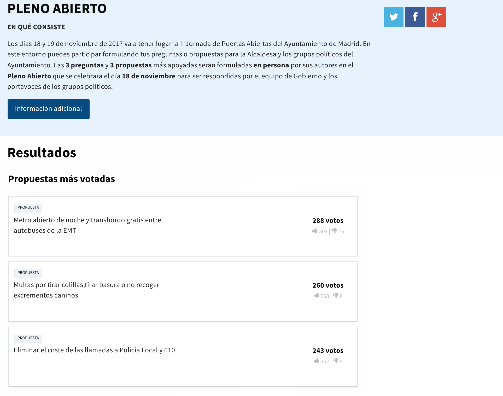 Un posible uso de esta fase que vemos a continuación es el de Pleno Abierto. Este proceso consistía en la posibilidad para los ciudadanos de enviar propuestas para el Pleno del Ayuntamiento. Las más apoyadas fueron las seleccionadas y se le dio la posibilidad a sus autores de presentar en persona sus propuestas en el Pleno, donde los portavoces de los grupos políticos responderían a las propuestas.